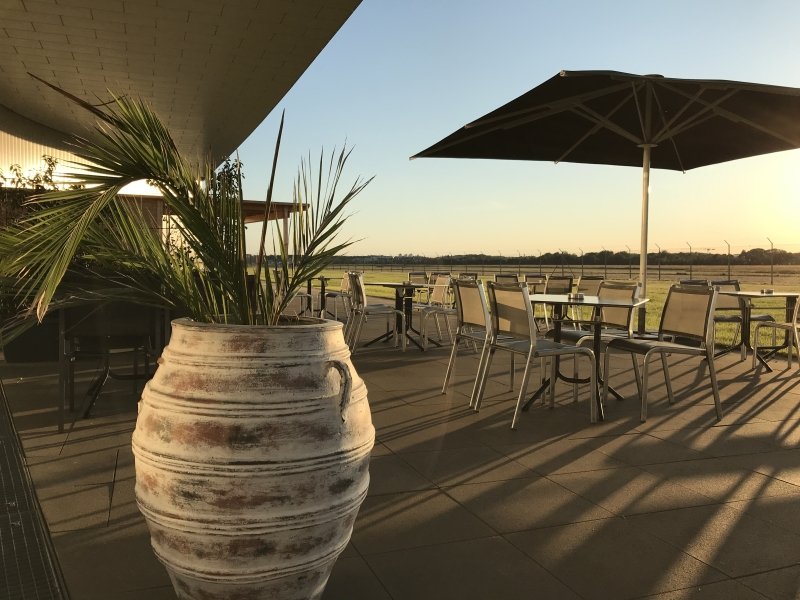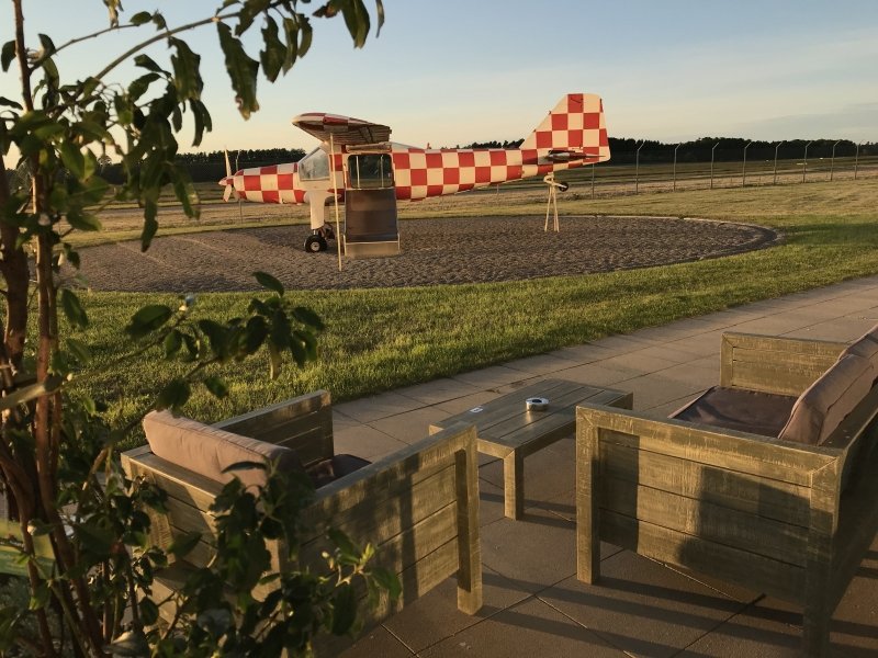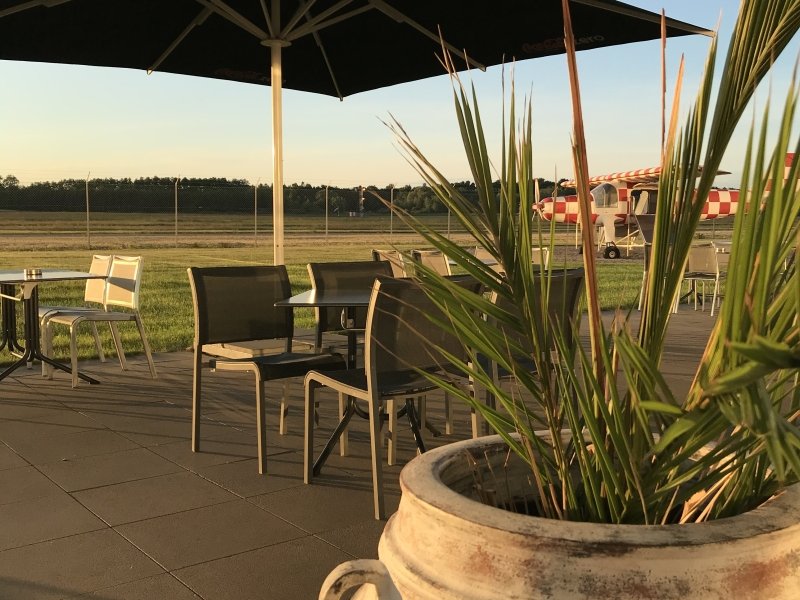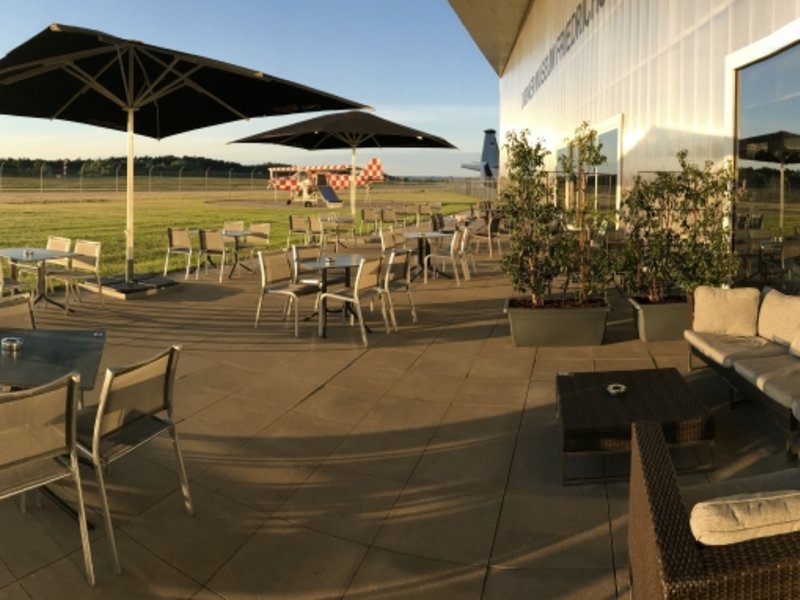 Die große Außenterrasse liegt auf der Nordseite des Museums und bietet neben der Aussicht auf das Rollfeld, den Zeppelinhangar und den Flughafenbetrieb eine atemberaubende Kulisse.